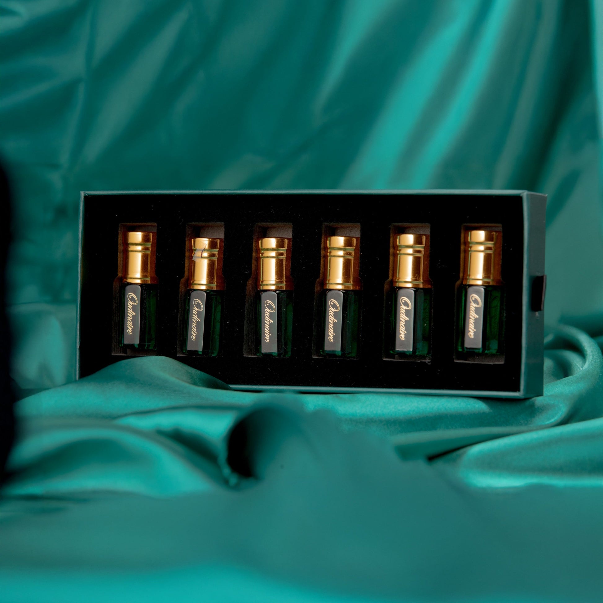 This curated set offers a selection of six 3ml pure oud oils, chosen from a range of ten exclusive oils, allowing you to personalize your collection with your favorite scents.